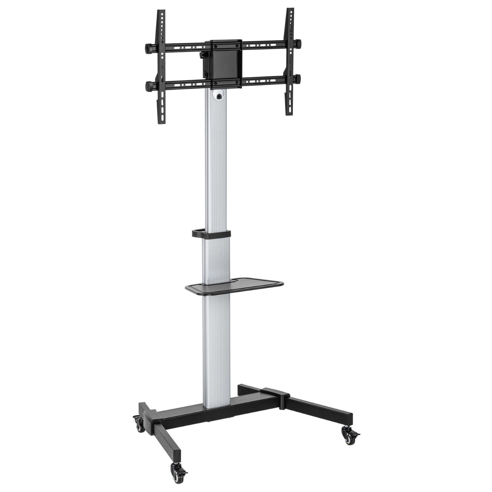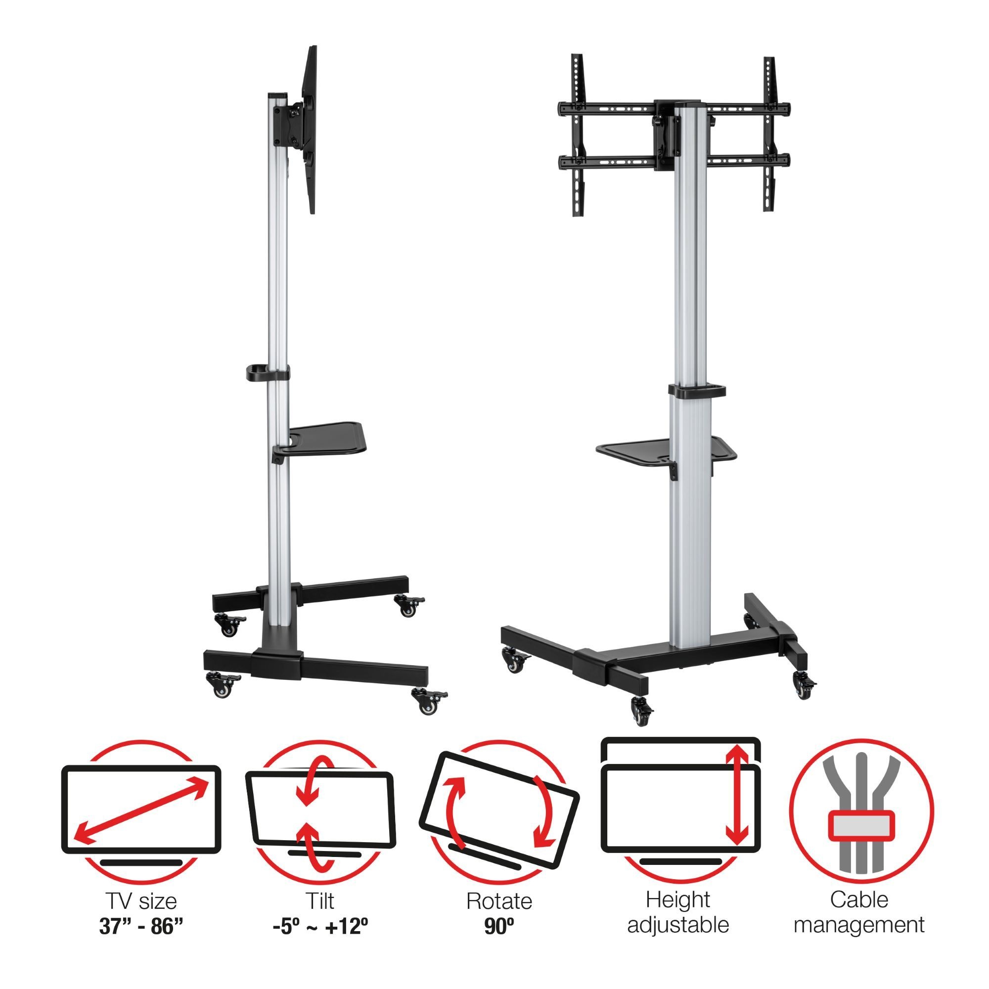 - HEIGHT ADJUSTABLE - The mobile TV stand has a height adjustable rear leg incorporating cable management and comes with a fully adjustable shelf which is ideal for webcams or other electronic device storage.