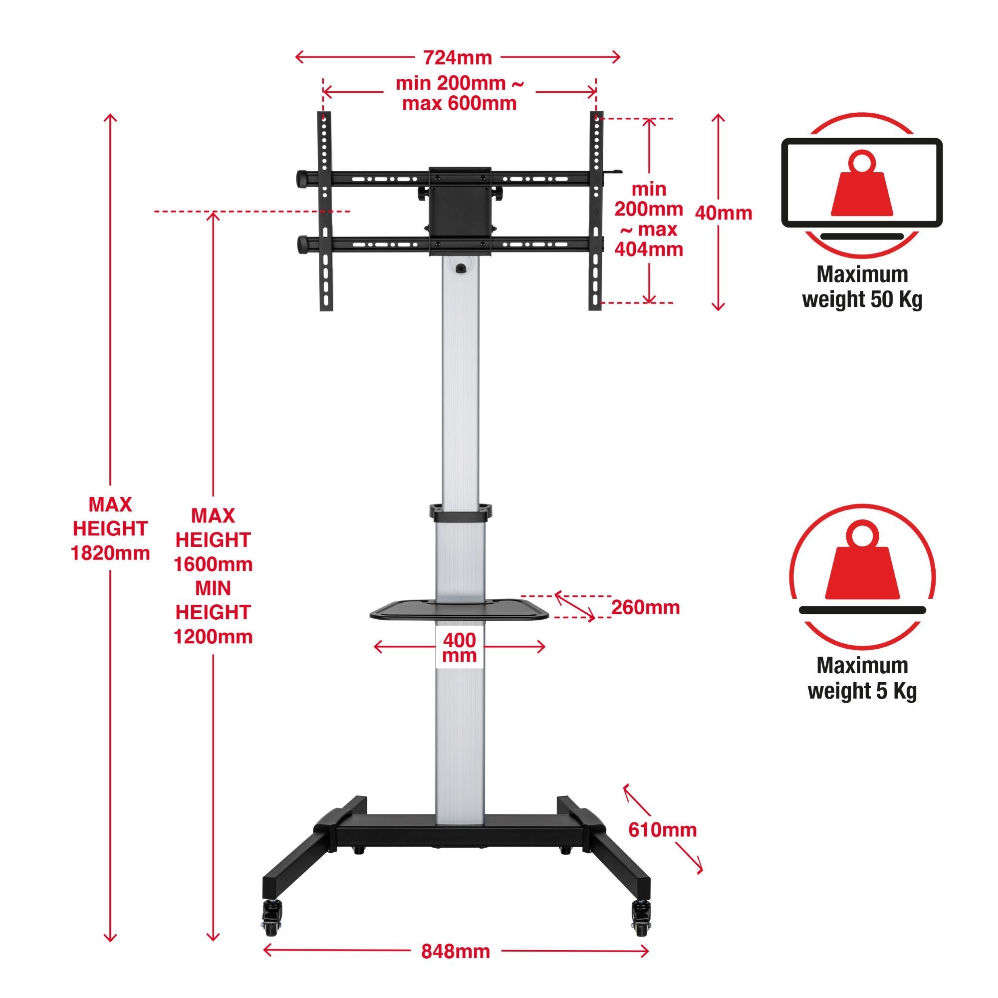 - UNIVERSAL MOBILE TV STAND ON WHEELS: The TV Cart fits most 37" to 86" Plasma, HDR, LCD, LED, flat screen and curved TVs weighing up to 50 Kgs. This mobile TV stand suits VESA sizes of 200x200, 300x200, 300x300, 400x200, 400x300, 400X400 and 600x400mm.