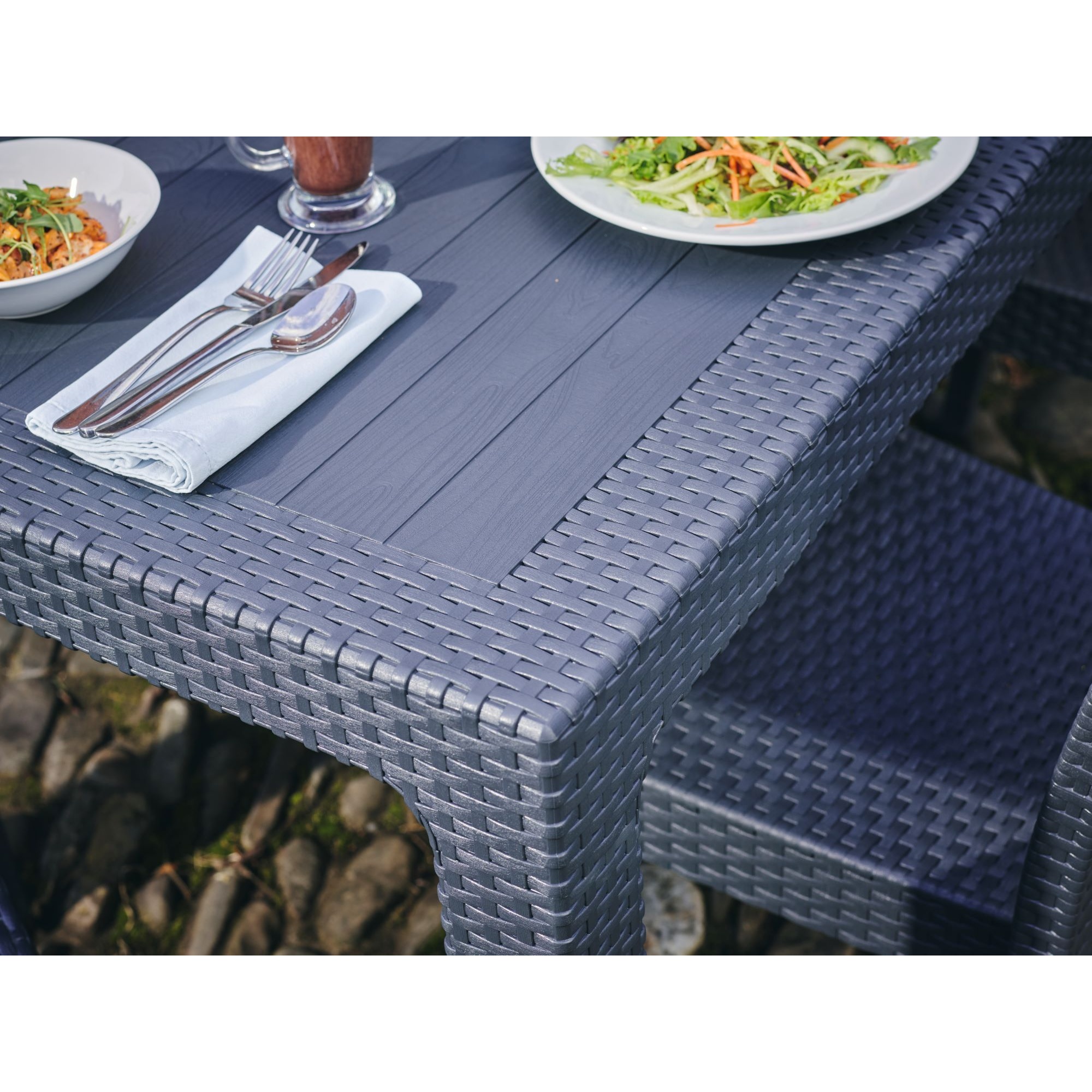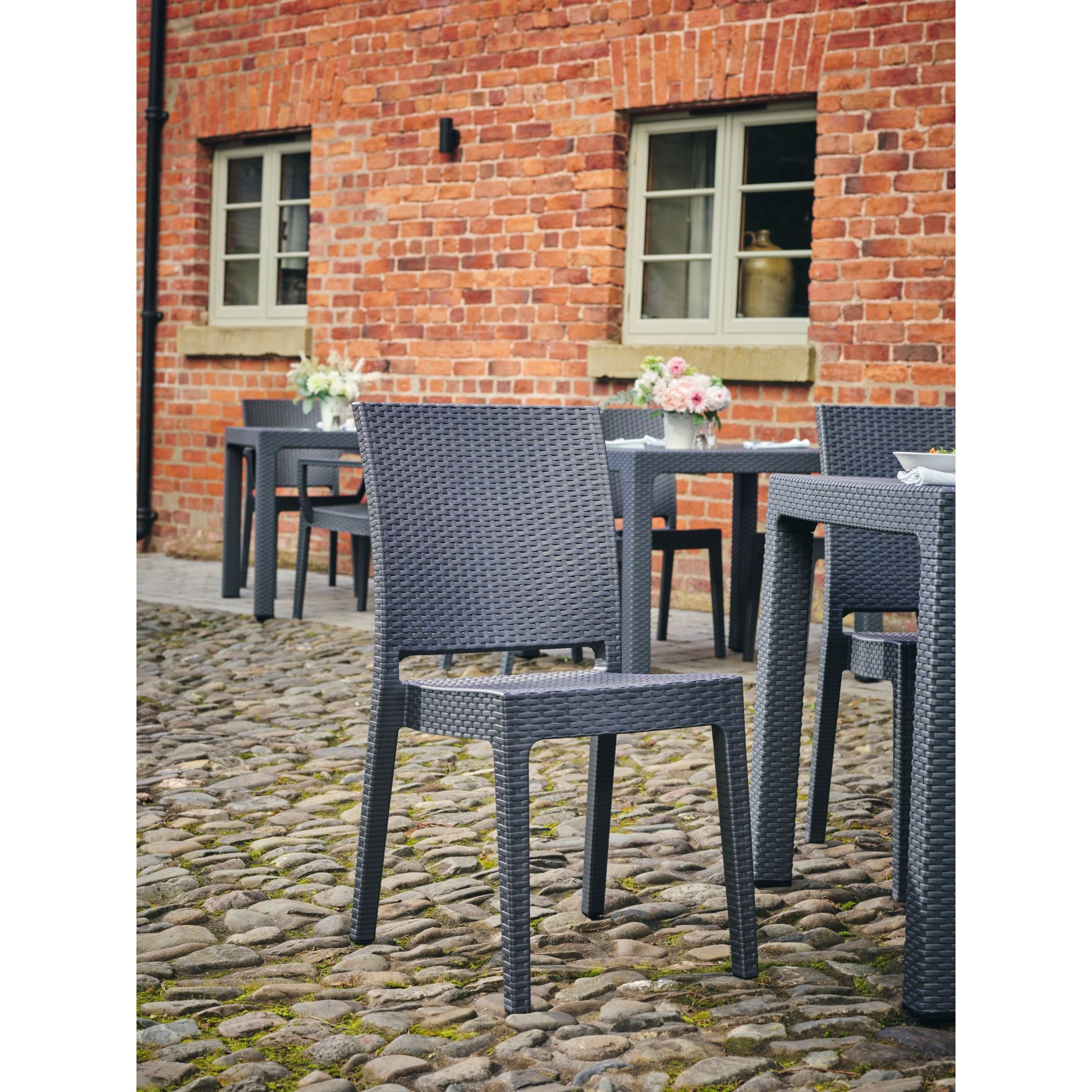 Canterbury polypropylene rattan 4 seater. A classic stable table for suitable for outdoor and contract use.