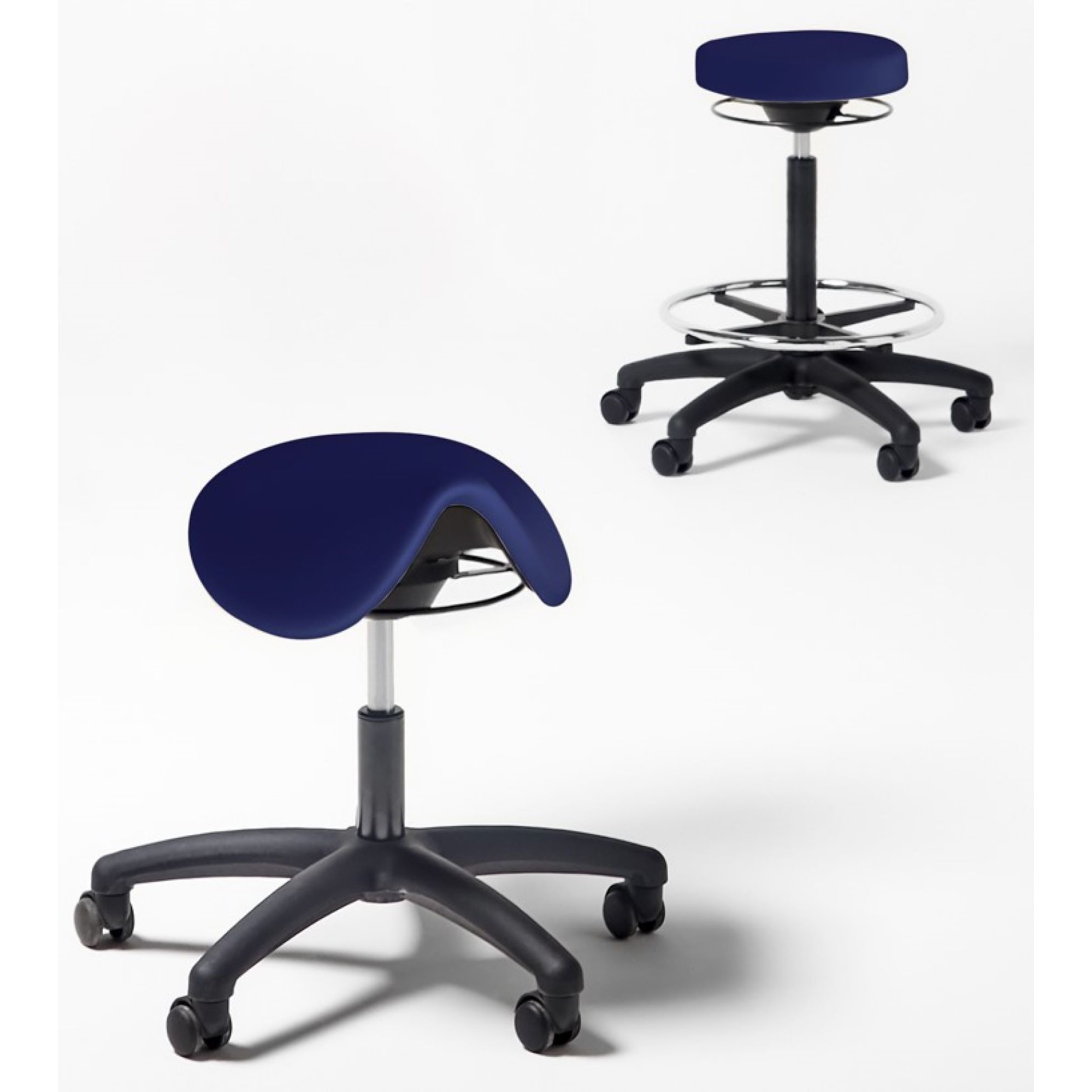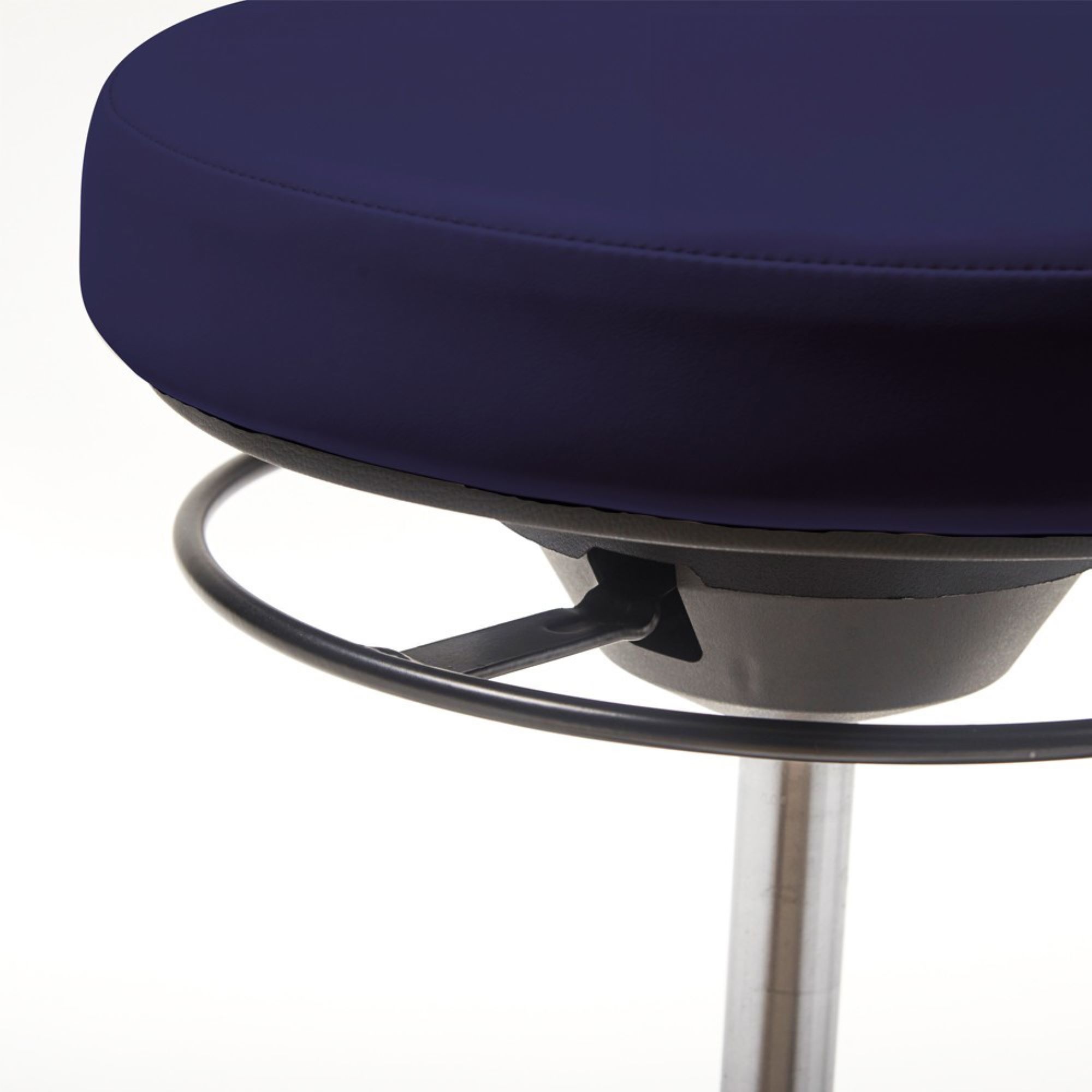Upholstered in a stain-resistant, waterproof vinyl covering called Panaz Zest 105 Indigo, the durable and fire-retardant, faux leather material is built to withstand the pressures of daily use in demanding environments. The easy-clean, robust surface reduces the time spent cleaning and maintaining, allowing for quick wipe-downs between tasks or shifts.Round Stool with Wheels for Smooth Mobility