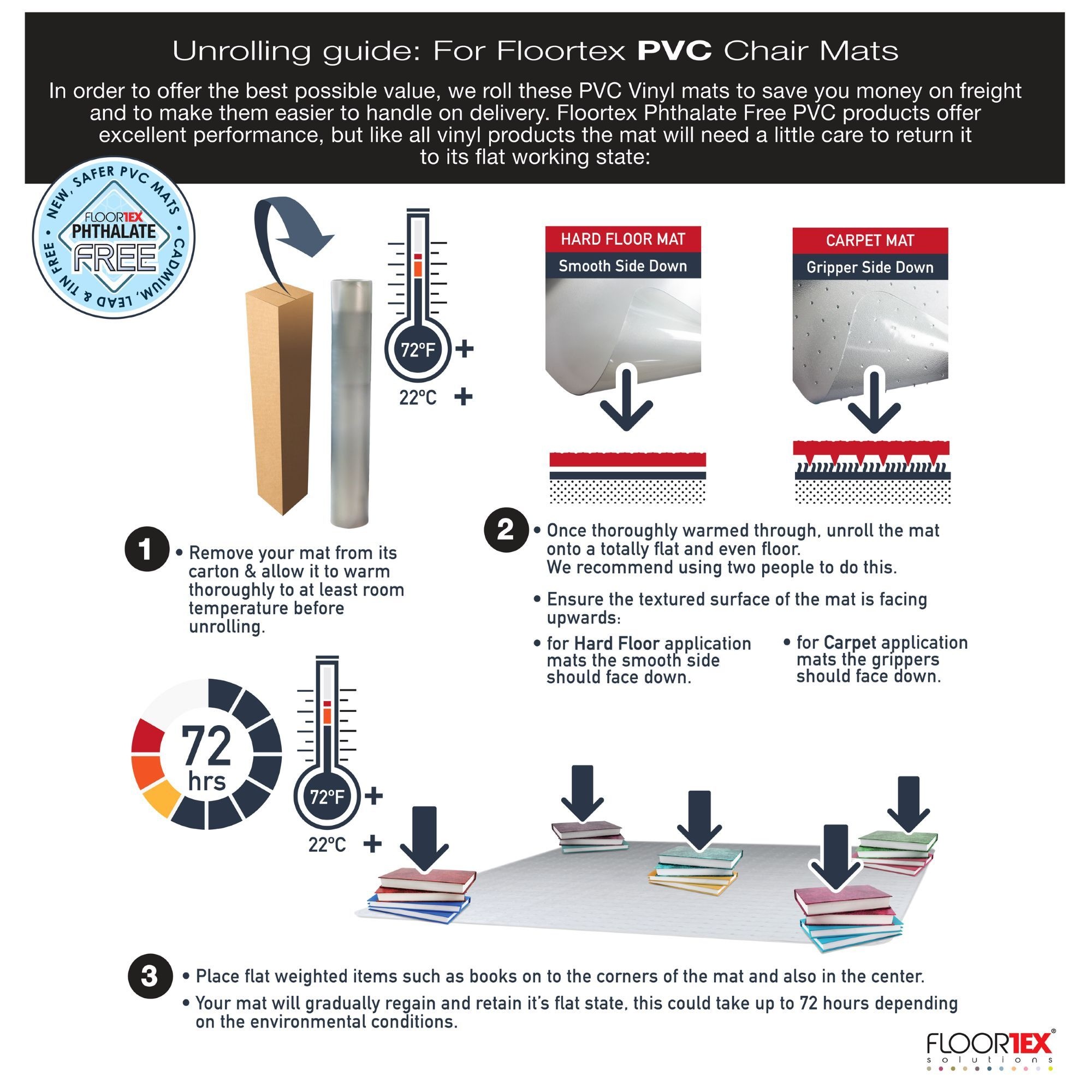 - Provides a smooth, rigid surface that allows easy movement which can reduce back and leg strain caused by castor chair movements.