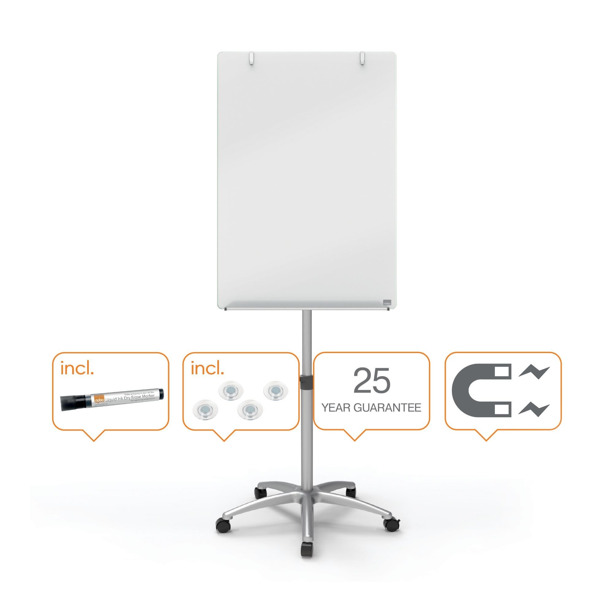 - Contents: 1 x Nobo Glass Flipchart Easel, includes 1 marker and 2 extra strong magnets, Brilliant White, 1903949, Whiteboard dimensions (HxW): 1000 x 700mm, Dimensions with stand (HxWxD): 1850 x 700 x 745mm, Weight: 20kg,.
