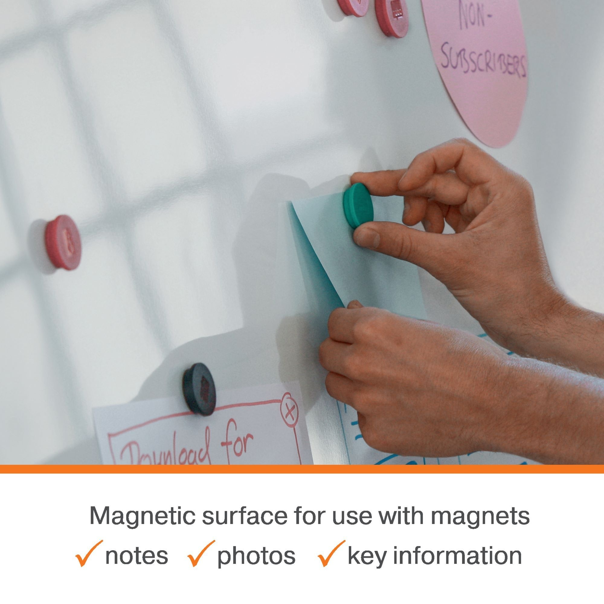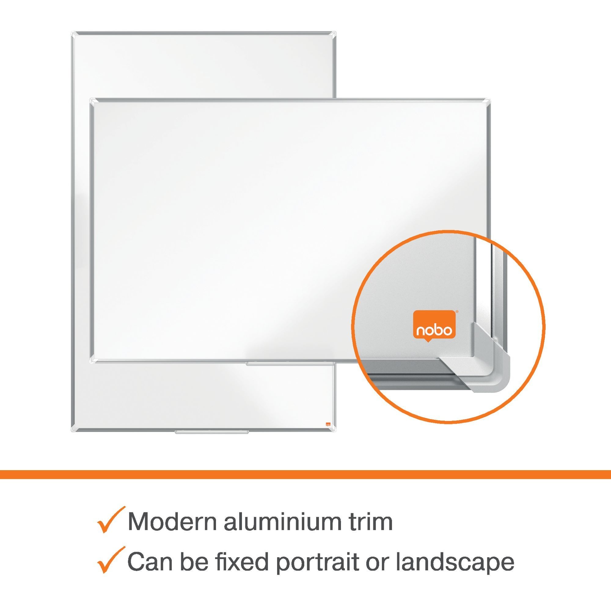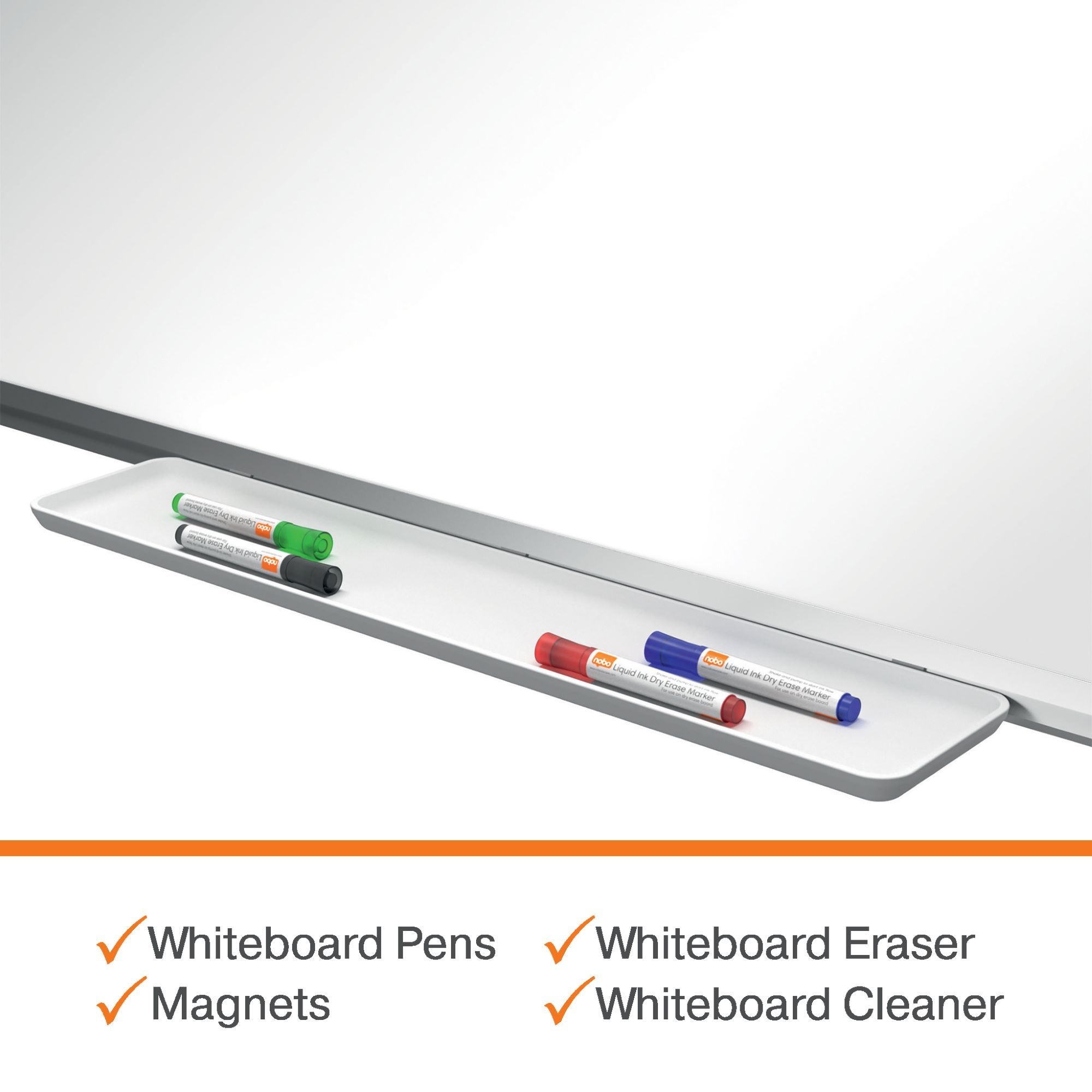 This board enhances writing clarity, making messages bold and easy to read. Its concealed traditional through-corner mounting allows installation in either portrait or landscape orientation for added flexibility. The magnetic surface is perfect for displaying notes, documents, and visual aids, while a convenient clip-on accessories tray keeps markers, erasers, and magnets organised and within reach.