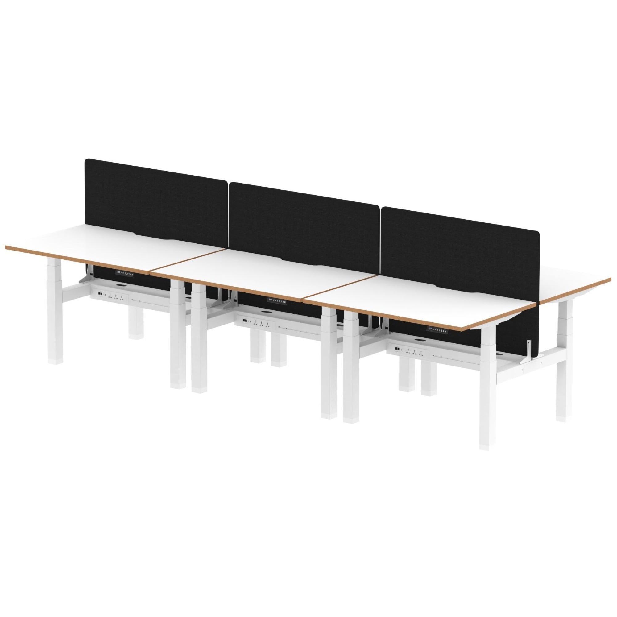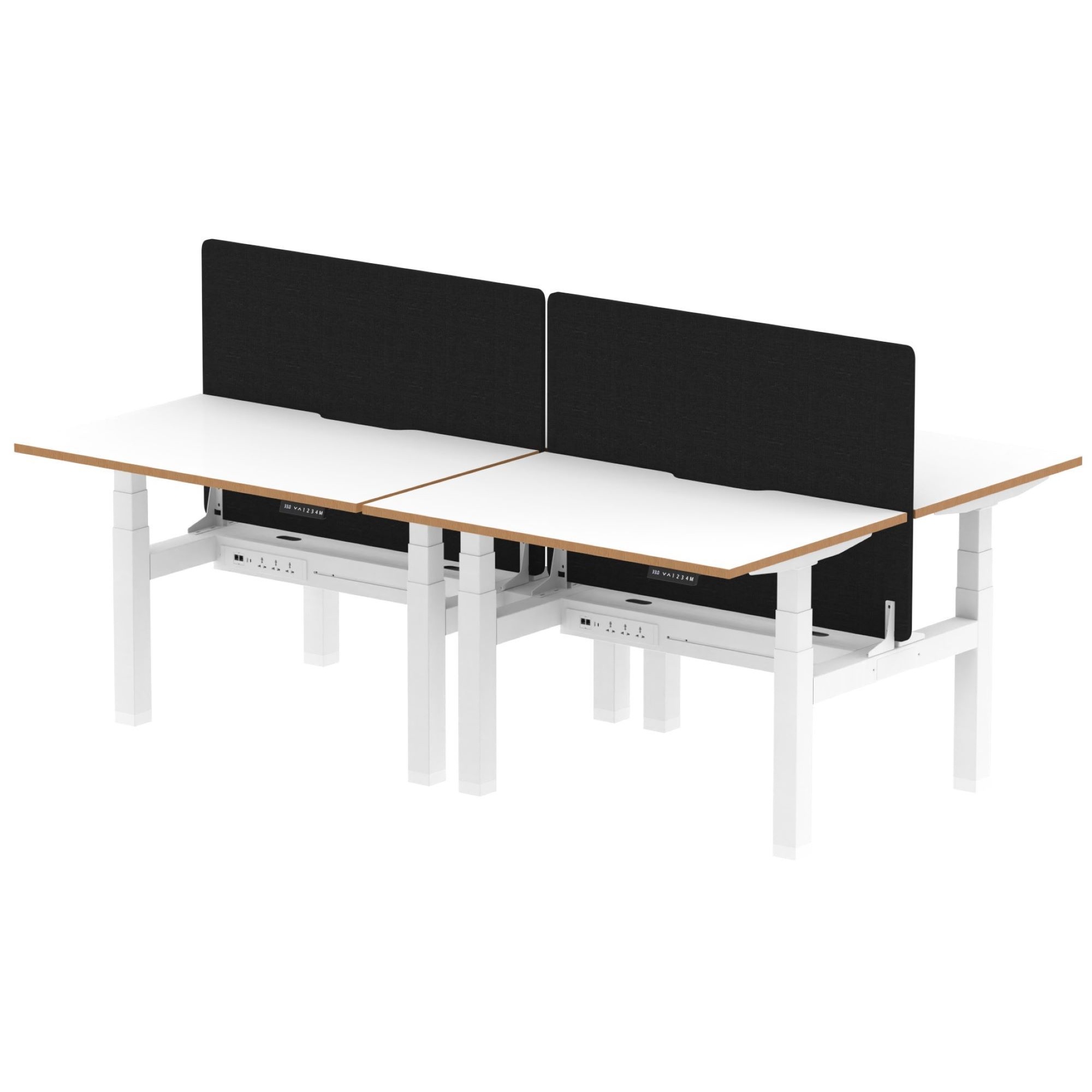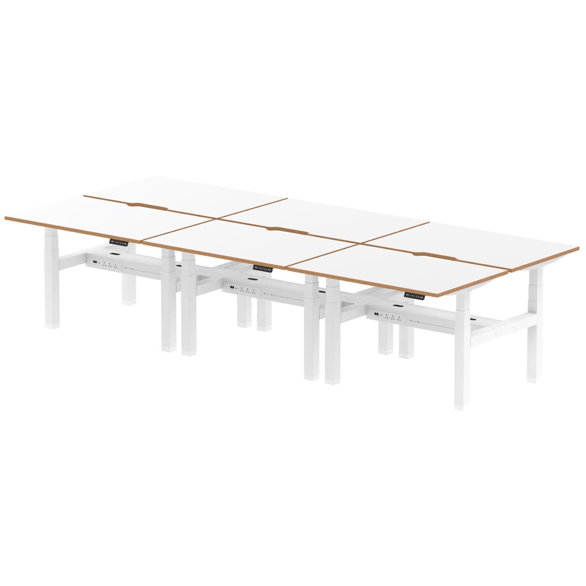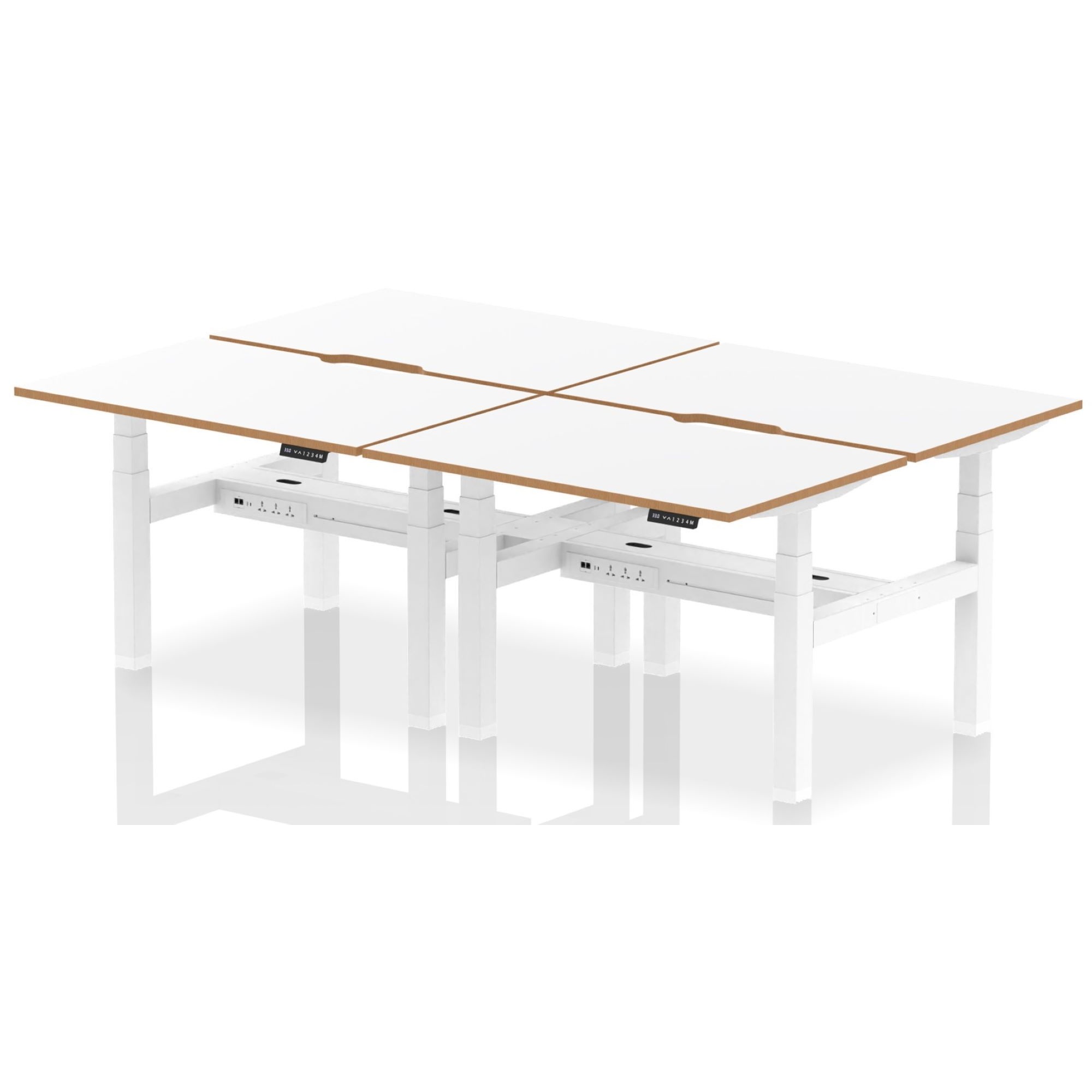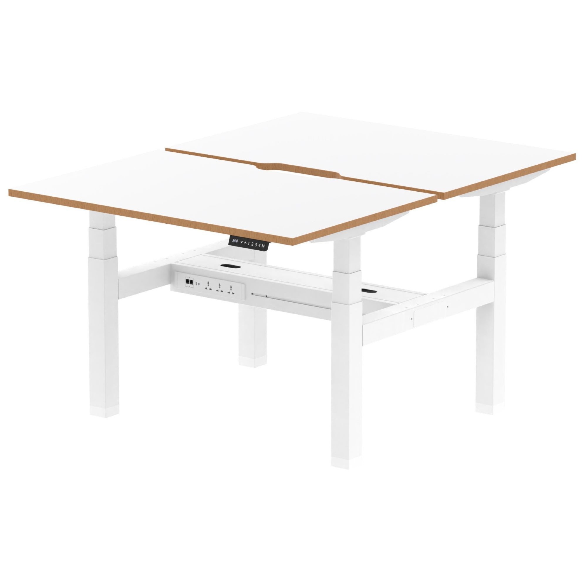 Elevate your office space with the OSLO Air Back-to-Back Height Adjustable Desk, is the epitome of efficiency and connectivity. This desk is the ultimate solution for teams seeking a connected, efficient, and adaptable workspace., where contemporary design meets ergonomic functionality. This desk is specifically crafted to cater to the dynamic needs of modern professionals. Integrated with three UK plug sockets, two ethernet ports, a USB-C and a USB port on each desk, catering to all digital needs and with integrated cable management to easily hide cables and extension leads. Tri-telescopic legs provide more stability when fully extended and a greater height range to accommodate all users. Back-to-back height adjustable desks blend ergonomic functionality with a sleek, contemporary aesthetic. The OSLO desktop, characterized by its clean white surface and elegant oak edging, provides a visually appealing and modern look that complements a range of office interiors. The white surface of the OSLO desktop offers a bright and spacious feel, making it conducive to focused work and creative thinking. The oak edging adds a touch of natural warmth and sophistication, creating a contrast that is both stylish and inviting.