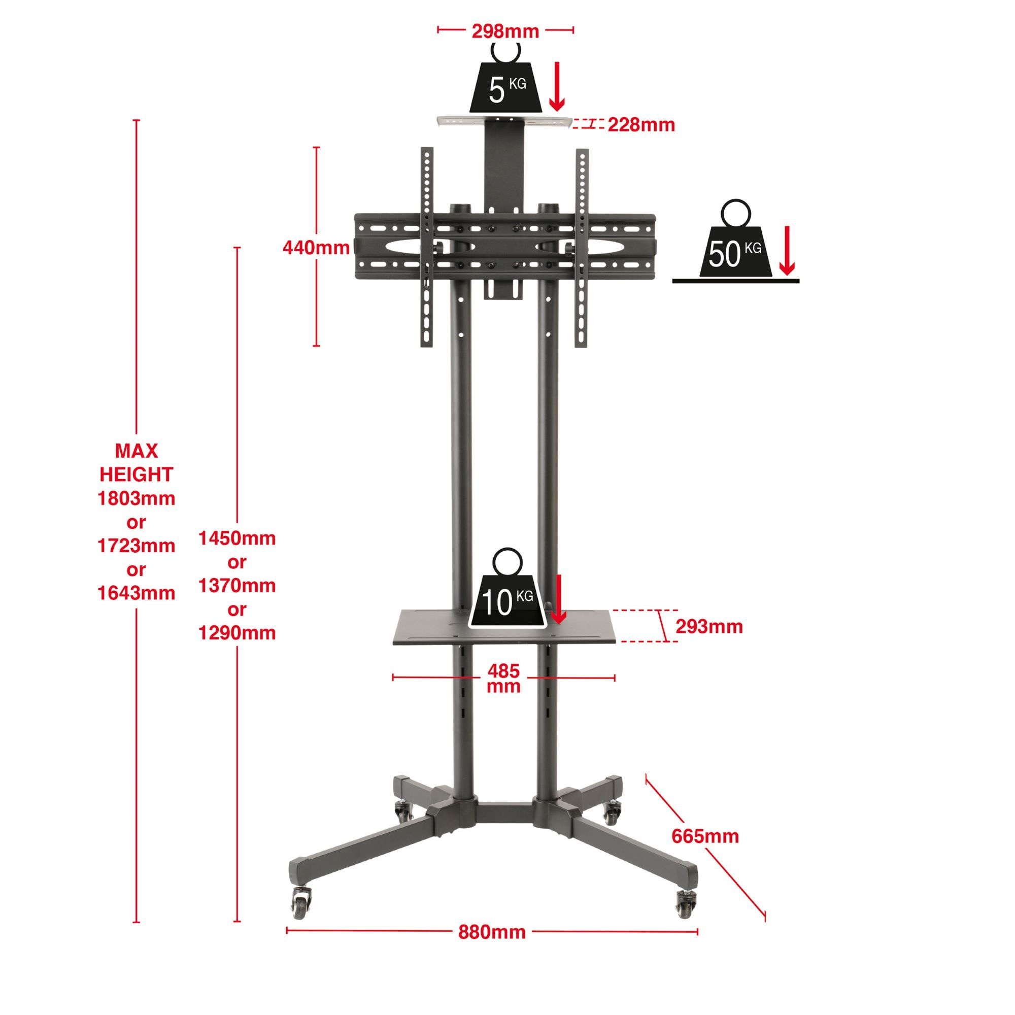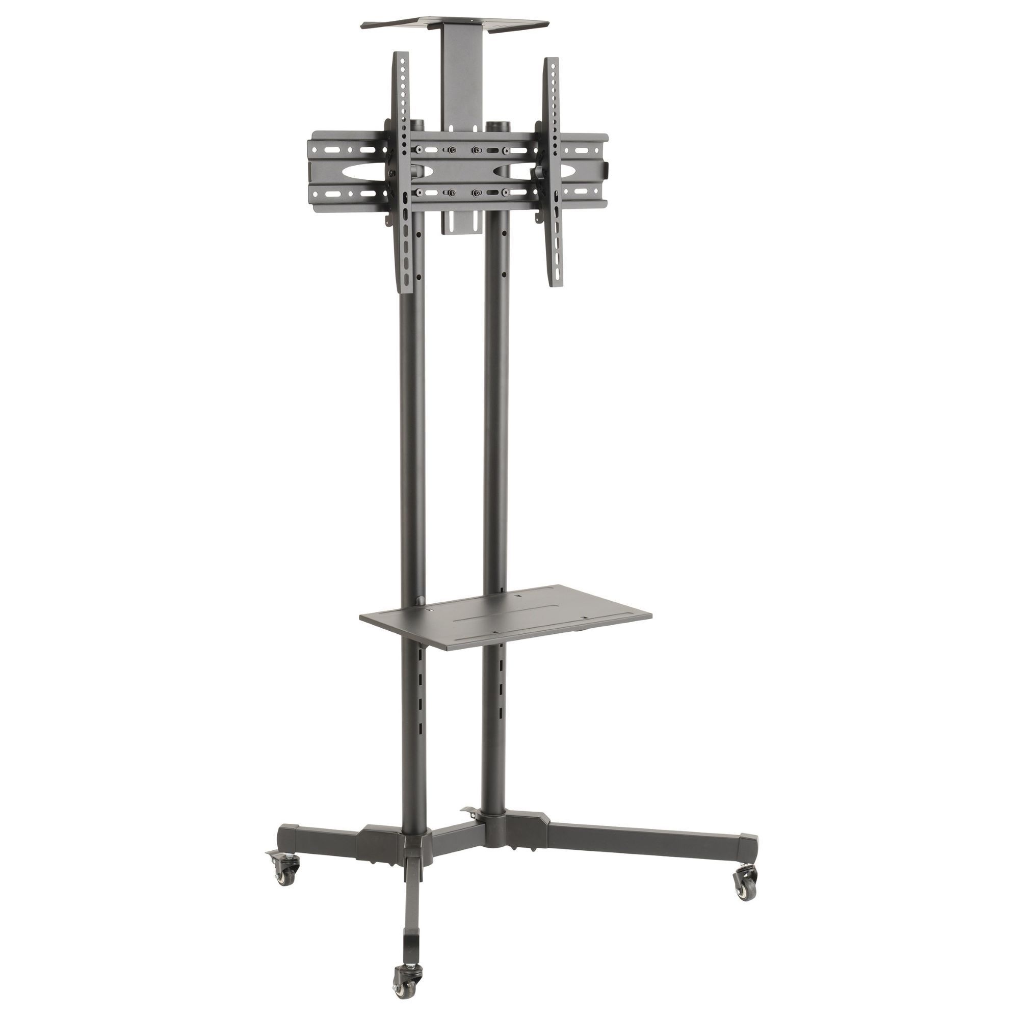 It is supplied with an AV shelf that has 3 height adjustments as well as a shelf that is fitted at the top of the stand which is also height adjustable, this is perfect for a web cam or projector unit. The TV stand trolley cart is suitable for most TV’s ranging from 32” – 70” with a minimum VESA size of 200mm x 200mm and a maximum VESA size of 600mm x 400mm, with a maximum weight capacity of 50 Kgs.