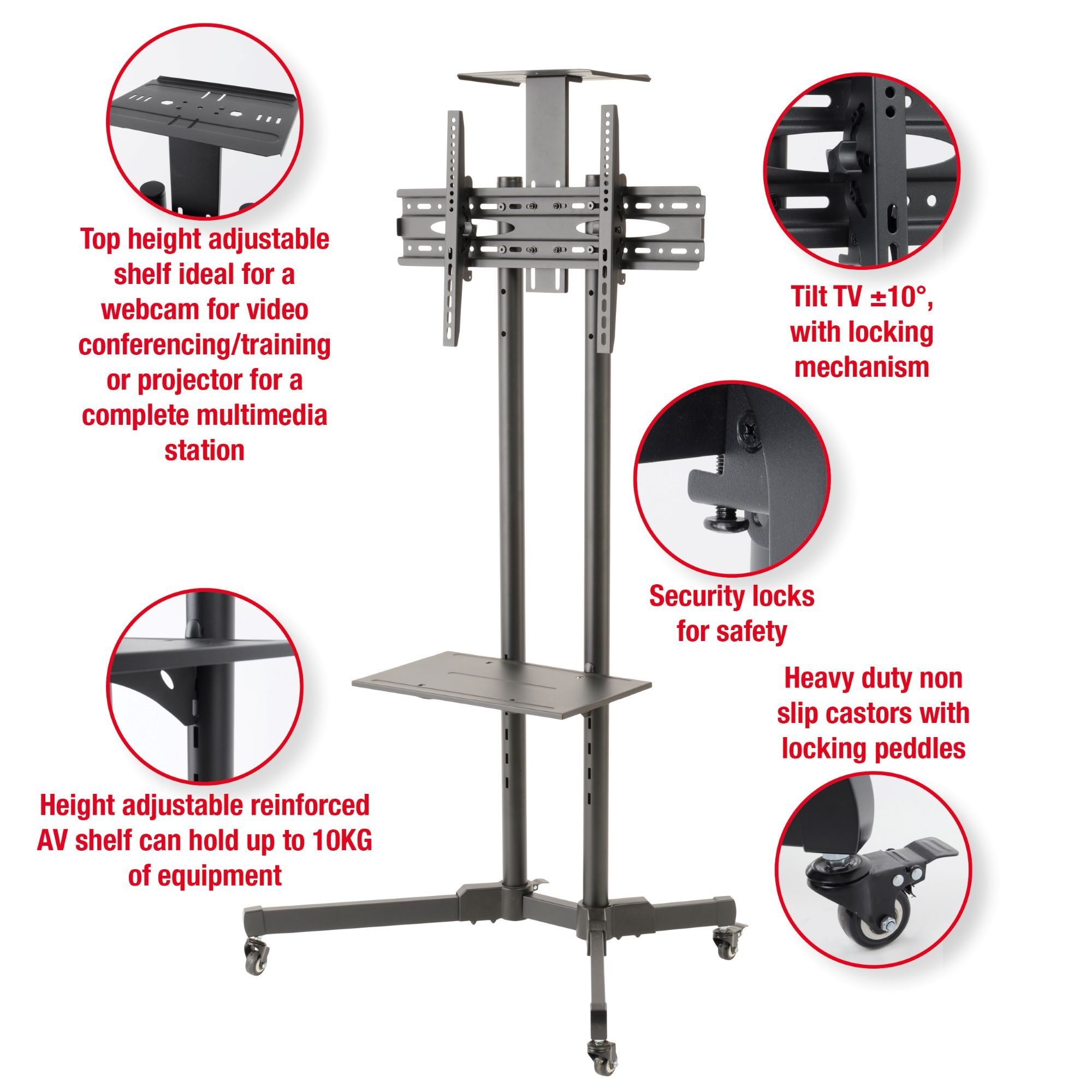 - HEIGHT ADJUSTABLE SHELF & PROJECTOR / WEB CAM SHELF – The mobile TV stand comes with 2 height adjustable shelves. The unit is customizable and if required these do not have to be fitted when the stand is assembled but if used provide ideal strong locations for electronic accessories such as a DVD player, web cam or projector